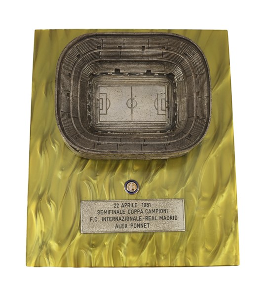 FC Internazionale - Real Madrid. Trofeo commemorativo della semifinale di ritorno della Coppa dei Campioni il 22 aprile 1981 allo stadio Giuseppe Meazza. L'Inter vince 1-0. Offerto all'arbitro belga Alex Ponnet. Dimensioni 15x19 centimetri. Commemorative trophy of the semi-final second leg match of the European Champion Clubs' Cup between F.C. Internazionale and Real Madrid on April 22, 1981 at the Giuseppe Meazza stadium. Inter win 1-0. Offered to the Belgian match referee Alex Ponnet. Dimensions 15x19 cm.