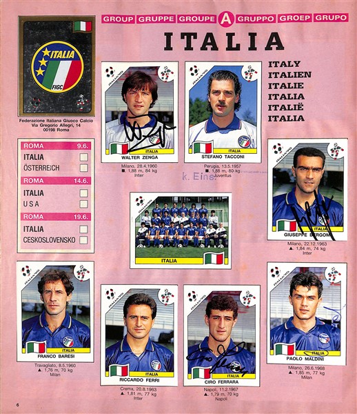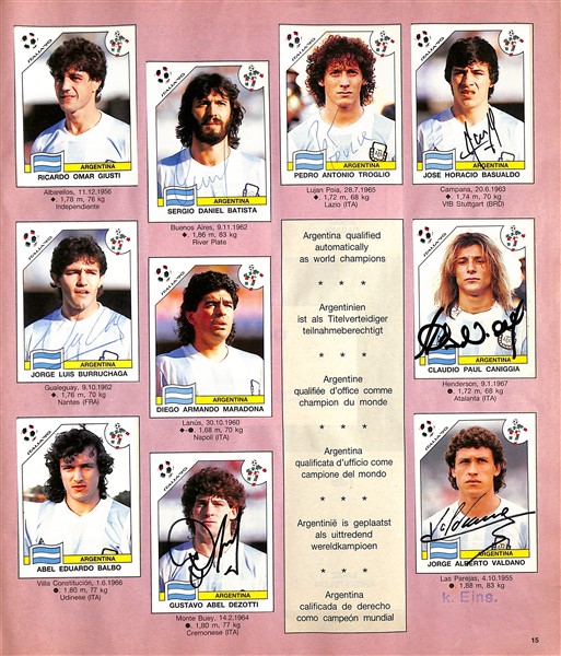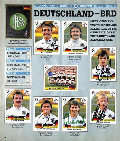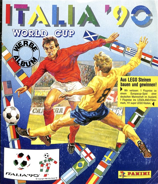 Album Panini "Italia 90" per la Coppa del Mondo 1990 in Italia. Completo delle sue 448 figurine delle quali 244 con autografi originali di giocatori tra cui (Paolo Maldini, Jorge Burruchaga, Dunga, Lothar Matthäus, Enzo Scifo, Emilio Butragueno, Enzo Francescoli, Gary Lineker, Marco Van Basten etc.) Esemplare pubblicitario LEGO, versione tedesca. Condizioni usate con leggere pieghe. Panini album “Italia 90” for the 1990 World Cup in Italy. Complete with its 448 stickers of which 244 with original autographs of players including (Paolo Maldini, Jorge Burruchaga, Dunga, Lothar Matthäus, Enzo Scifo, Emilio Butragueno, Enzo Francescoli, Gary Lineker, Marco Van Basten etc.) LEGO advertising example, German version. Used condition with light creases.