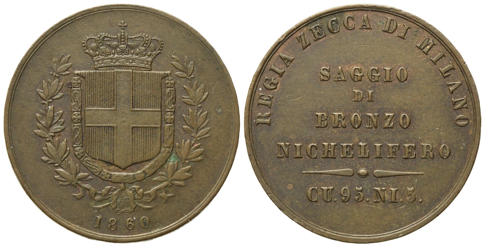 REGNO D'ITALIA. Milano. Vittorio Emanuele II Re Eletto (1859-1861). Saggio di bronzo nichelifero per moneta da 5 Centesimi 1860. Cu (5,14 g; 25,47 mm)
