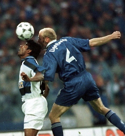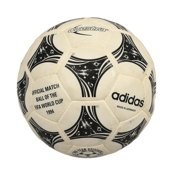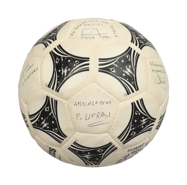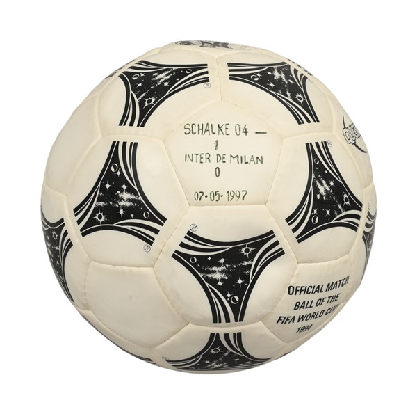 Schalke 04 - FC Internazionale. Pallone ufficiale utilizzato durante la Finale di Coppa Uefa , gara di andata, il 7 maggio 1997 al Parkstadion di Gelsenkirchen. Vittoria per 1-0 dello Schalke04 con un gol di Marc Wilmots al 70esimo minuto. Pallone da gara Adidas Questra ufficiale Coppa del Mondo 1994. Sul pallone presenti autografi ed annotazioni dell'arbitro Marc Batta e dei suoi assistenti Gilles Veissière e Jacques Poudevigne. Official ball used in the first leg of the UEFA Cup final on May 7, 1997 at the Parkstadion in Gelsenkirchen. Schalke wins 1-0 with a goal from Marc Wilmots in the 70th minute. Adidas Questra Official Match Ball of the FIFA World Cup 1994. Autographs and annotations from referee Marc Batta and his assistants Gilles Veissière and Jacques Poudevigne on the ball.