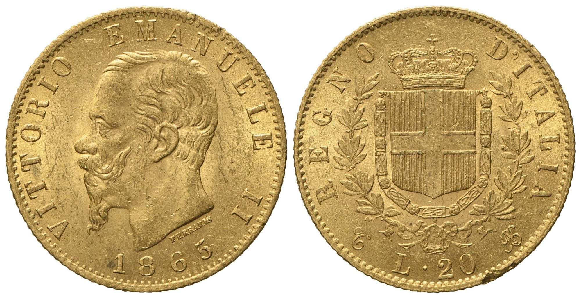 REGNO D'ITALIA. Torino. Vittorio Emanuele II (1861 - 1878). 20 lire 1865. Au (6,46 g; 20,8 mm).