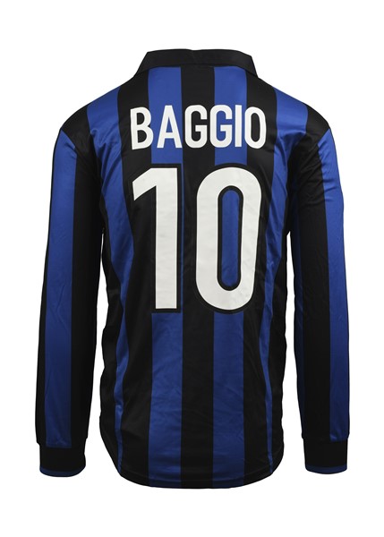 Roberto BAGGIO. Maglia Nr.10 FC Internazionale preparata per il Campionato Italiano di Serie A 1998/1999. Il giocatore partecipò a 23 incontri. Partita da determinare. Marca Nike. Modello Nike-Fit. Prodotta in Gran Bretagna. Taglia L. Maglia preparata. FC Internazionale jersey No.10 prepared for the 1998-1999 season of the Italian Serie A Championship. The player participated in 23 matches. Match to be determined. Nike brand. Nike-Fit model. Made in the UK. Size L. Prrepared jersey.(match issued shirt).