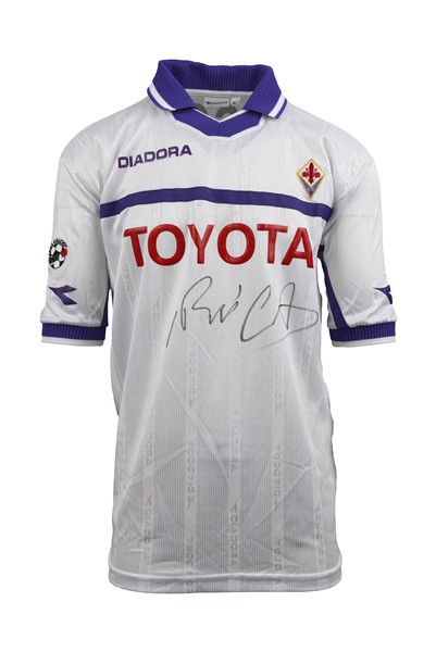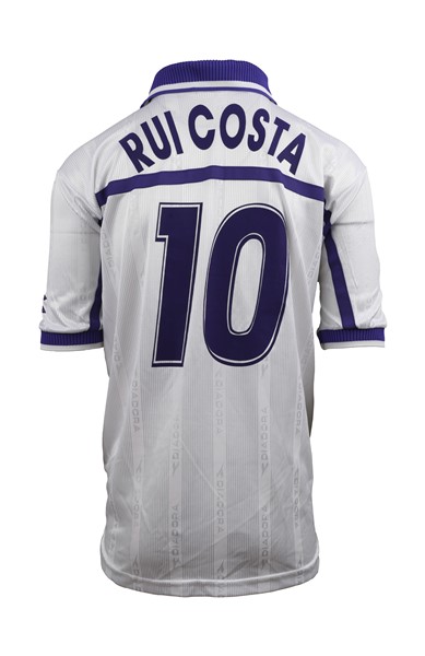 Rui COSTA. Maglia Nr.10 ACF Fiorentina preparata per la stagione 2000/2001 del Campionato Italiano di Serie A. Il giocatore disputò 29 incontri. Partita da determinare. Presente autografo originale del portoghese. Marca Diadora. Prodotta in Italia. Taglia XL. Maglia preparata. ACF Fiorentina jersey No.10 prepared for the 2000-2001 season of the Italian Serie A Championship. The player participated in 29 matches. Match to be determined. Authentic player autograph. Diadora brand. Made in Italy. Size XL. Match issued shirt.