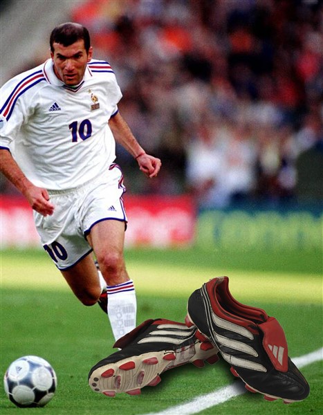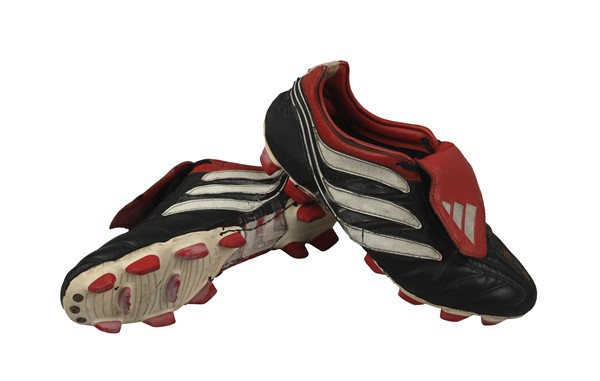 Zinedine ZIDANE. Paio di scarpe portate in allenamento alla Juventus di Torino durante la stagione 2000-2001. Scarpe prova di transizione marca Adidas, modello Predator Precision “Traxion” in cuoio, tacchetti sagomati, modello presentato durante il Campionato Europeo 2000. Il giocatore lascia la Juventus per il Real Madrid a fine stagione. Cambierà modello nel corso della stagione 2002/2003. Cerotti presenti sulle scarpe all'altezza del tallone (abitudine di Zinedine Zidane). Oggetti rari. Scarpe usate in allenamento. Pair of boots worn in training by Juventus Turin player during the 2000-2001 season. Adidas Predator Precision “Traxion” transition boots, model in leather, shaped studs. Model presented during the 2000 European Championship. The player leaves Juventus for Real Madrid at the end of the season. He will change model during the 2002/2003 season. Plasters on the boots at heel level (Zinedine Zidane's habit). Rare items. Boots used in training.