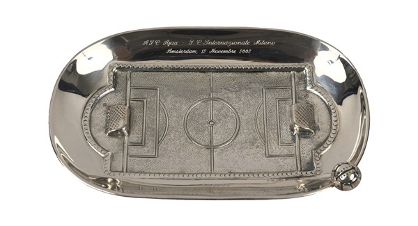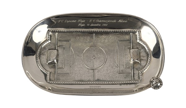 FC Internazionale. Set di 2 svuotatasche per le partite di Coppa dei Campioni contro l'Ajax del 12 novembre 2002 e contro la Dynamo Kyiv il 10 dicembre 2003. Offerto ad Alex Ponnet, supervisore della partita. In metallo argentato. Dimensioni 10,5x17,5 cm. Entrambi nelle loro scatole originali. Set of 2 pockets emptier for the European Cup matches against Ajax on November 12, 2002 and Dynamo Kyiv on December 10, 2003. Offered to Alex Ponnet, match supervisor. In silver metal. Dimensions 10.5x17.5 cm. In their original boxes.
