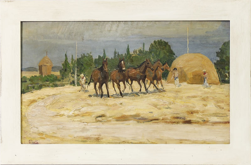 LUIGI GIOLI (1854-1947) Paesaggio campestre con cavalli e contadini - Country Landscape with Horses and Farmers olio su tavoletta - oil on panel, firmato, in cornice cm 33,5x55