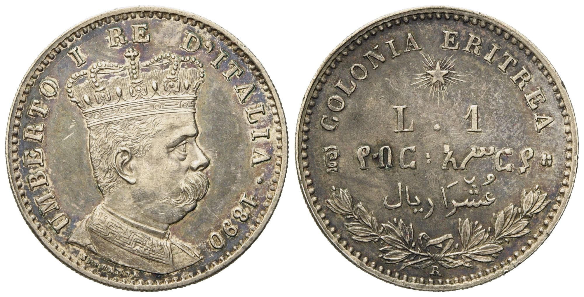 Lotto 699 | REGNO D'ITALIA. Colonia Eritrea. Umberto I (1890-1896). 1 Lira - 2/10 Tallero 1890. Ag (4,97 g; 23,1 mm)