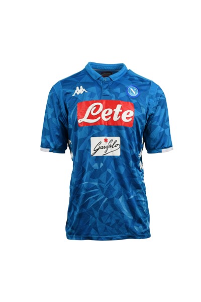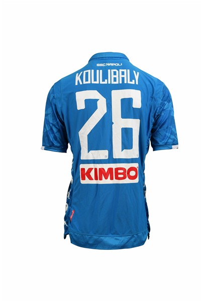 Kalidou KOULIBALY. Maglia Nr.26 SSC Napoli indossata durante la stagione 2018/2019 del Campionato Italiano di Serie A. Il giocatore disputò 35 incontri. Partita da determinare. Marca Kappa. Modello Kombat. Prodotta in Cina. Taglia XL. Maglia indossata e non lavata. SSC Napoli jersey No.26 worn during the 2018-2019 season of the Italian Serie A Championship. The player participated in 35 matches. Match to be determined. Kappa brand. Kombat model. Made in China. Size XL. Match worn shirt, unwashed.