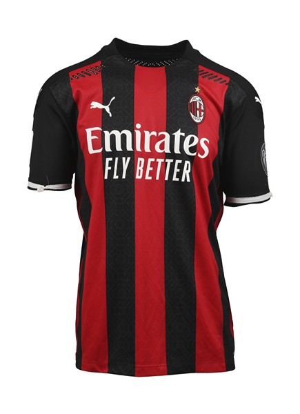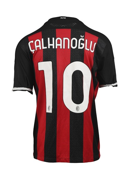 Hakan ÇALHANOGLU. Maglia Nr.10 AC Milan indossata durante la stagione 2020/2021 del Campionato Italiano di Serie A. Il giocatore disputò 33 incontri. Partita da determinare. Marca Puma. Modello DryCell. Prodotta in Cina. Taglia L. Maglia indossata in gara. AC Milan jersey No.10 worn during the 2020-2021 season of the Italian Serie A Championship. The player participated in 33 matches. Match to be determined. Puma brand. DryCell model. Made in China. Size L. Match worn shirt.