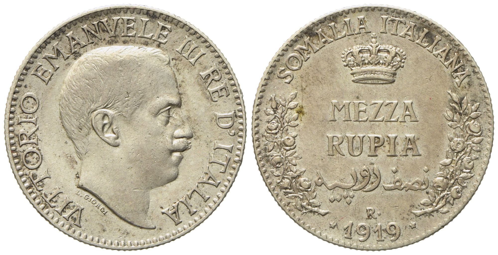 Lotto 725 | SOMALIA ITALIANA. Vittorio Emanuele III (1909-1925). Mezza rupia 1919. Ag (24,33 mm; 5,81 g)