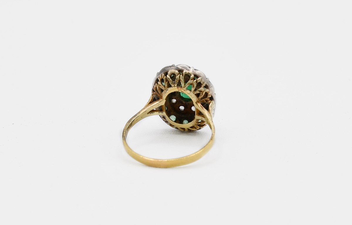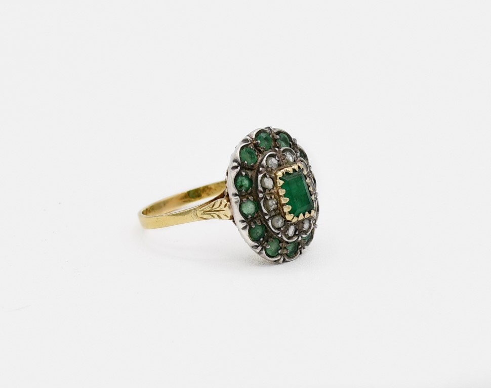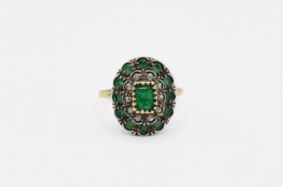 Anello in oro giallo e argento con smeraldi e rosette di diamanti