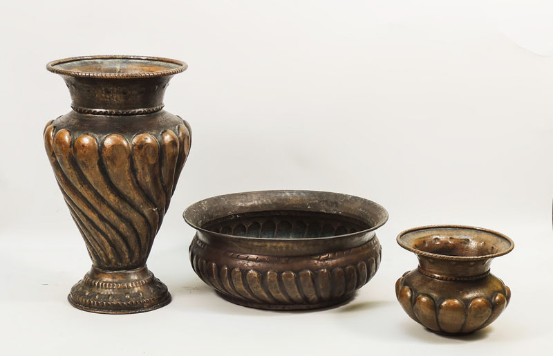 LOTTO DI OGGETTI IN RAME - COPPER LOT un bacile e due vasi, corpi baccellati...