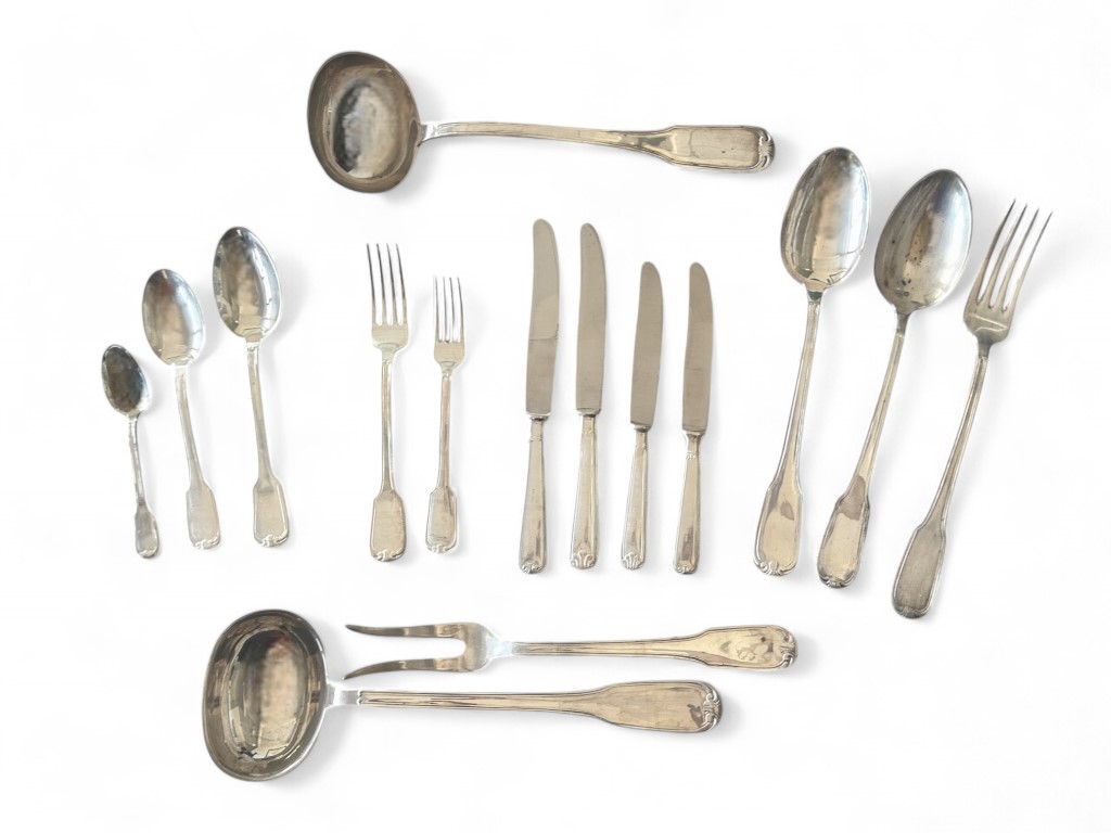 23 forchette grandi, 30 forchette piccole, 29 cucchiai grandi, 27 cucchiaini, 31 cucchiai da dessert, 32 coltelli grandi, 33 coltelli piccoli e 6 posate di servizio (211)