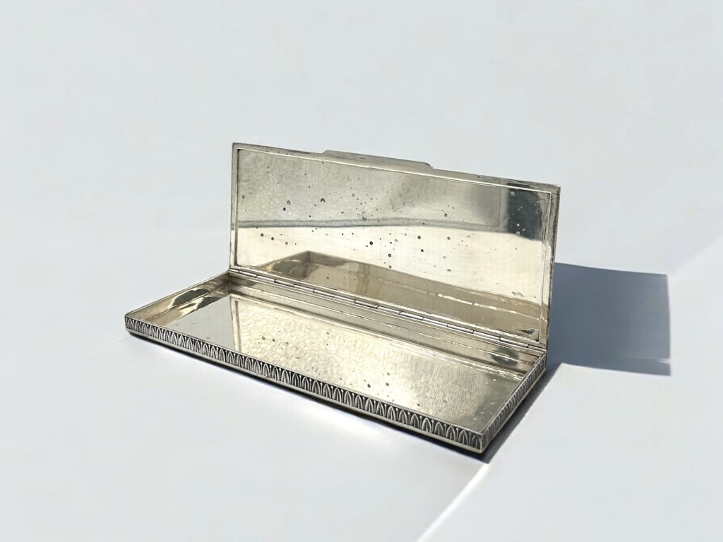 Precedente Lotto 50 Successivo Guidoriccio Casa d'Aste - Via ferraris 128, 52100 AREZZO Gioielli, Orologi e Argenti sessione unica mercoledì 27 novembre 2024 ore 15:00 (UTC +01:00) Scatola rettangolare in argento 800 Scatola rettangolare in argento 800 gr 419 cm 9x22x1,3