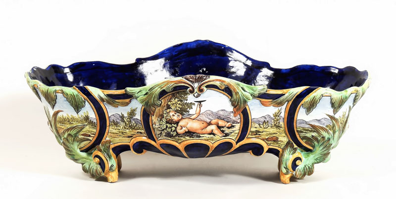 CENTROTAVOLA IN CERAMICA POLICROMA - PAINTED CERAMIC CENTREPIECE dipinto con paesaggio, puttino e pappagallo, interno blu Marcato sotto la base Ginori coronato 280-871 h cm 16x44x24