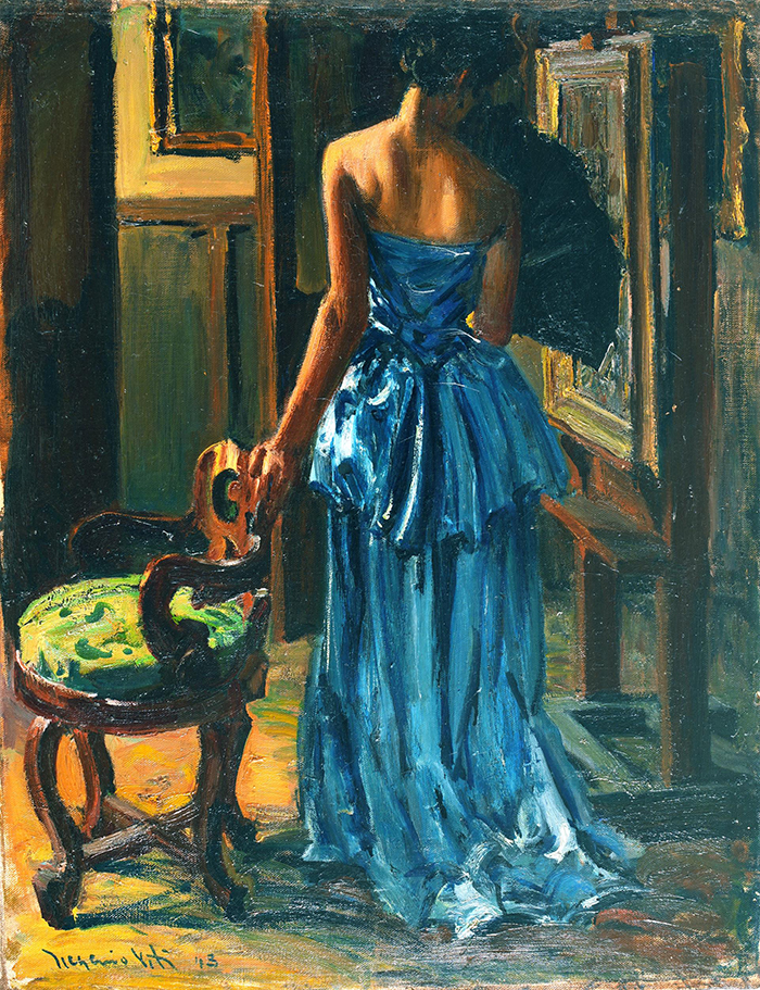 Viti Eugenio (Napoli 1885 -1952) L'abito blu olio su tela cm 66x52 firmato e datato in basso a sinistra: Eugenio Viti 43