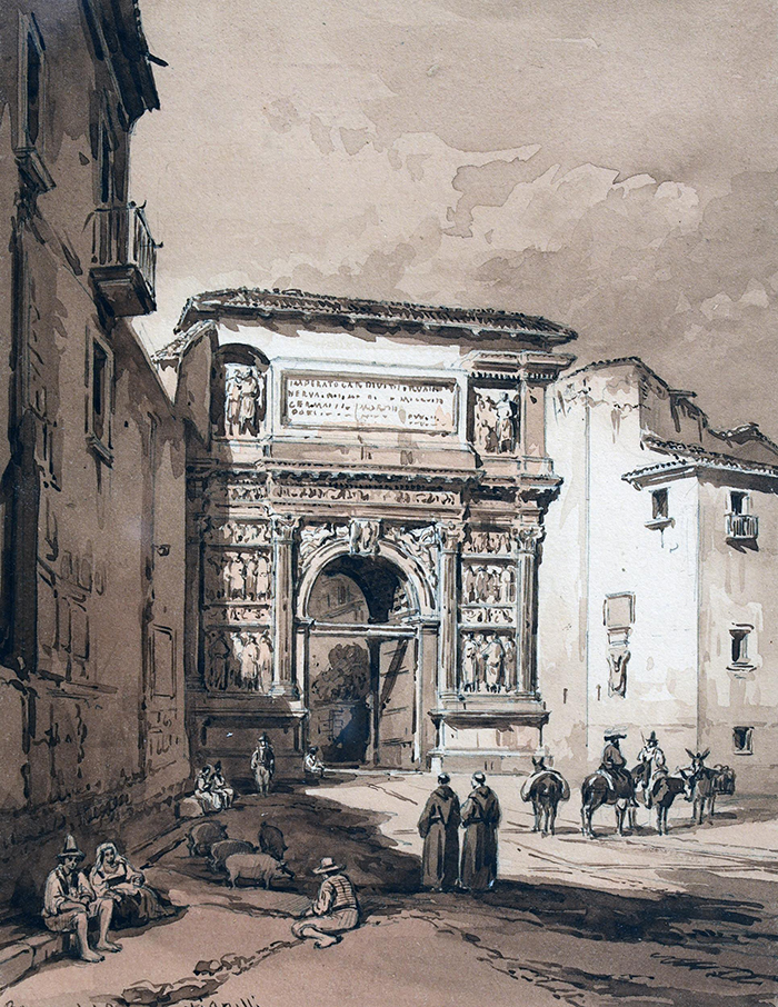 Vianelli Achille (Porto Maurizio, IM 1803 - Benevento 1894) Arco di Traiano seppia su carta, cm 19x14 firmato datato e iscritto in basso a sinistra: Benevento 49 Vianelli