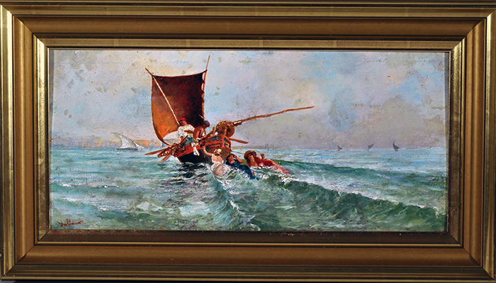 Dalbono Edoardo ( Napoli 1841 - 1915 ) Marina con pescatori olio su tavola, cm 23x40 firmato in basso a sinistra: Dalbono