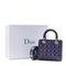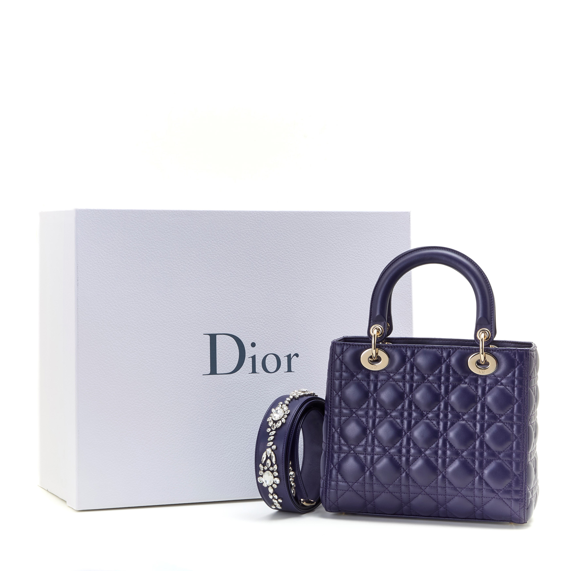 Dior navy blue leather Lady Dior and silver metal hardware with removable shoulder strap embellished by rhinestones. Original dustbag and box included. Like new.