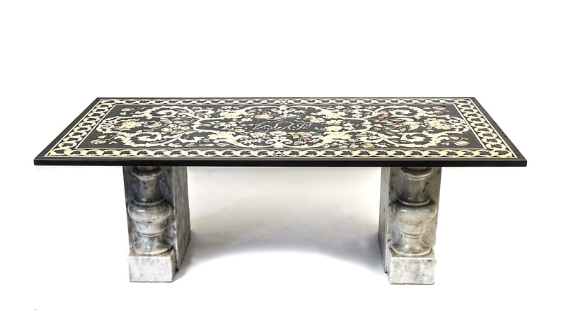 TAVOLINO BASSO DA CENTRO - SCAGLIOLA AND MARBLE COFFEE TABLE il piano in scagliola con intreccio di motivi floreali policromi, la base architettonica in marmo bianco con intarsi in marmo rosso e nero h cm 47,5x140,5x65