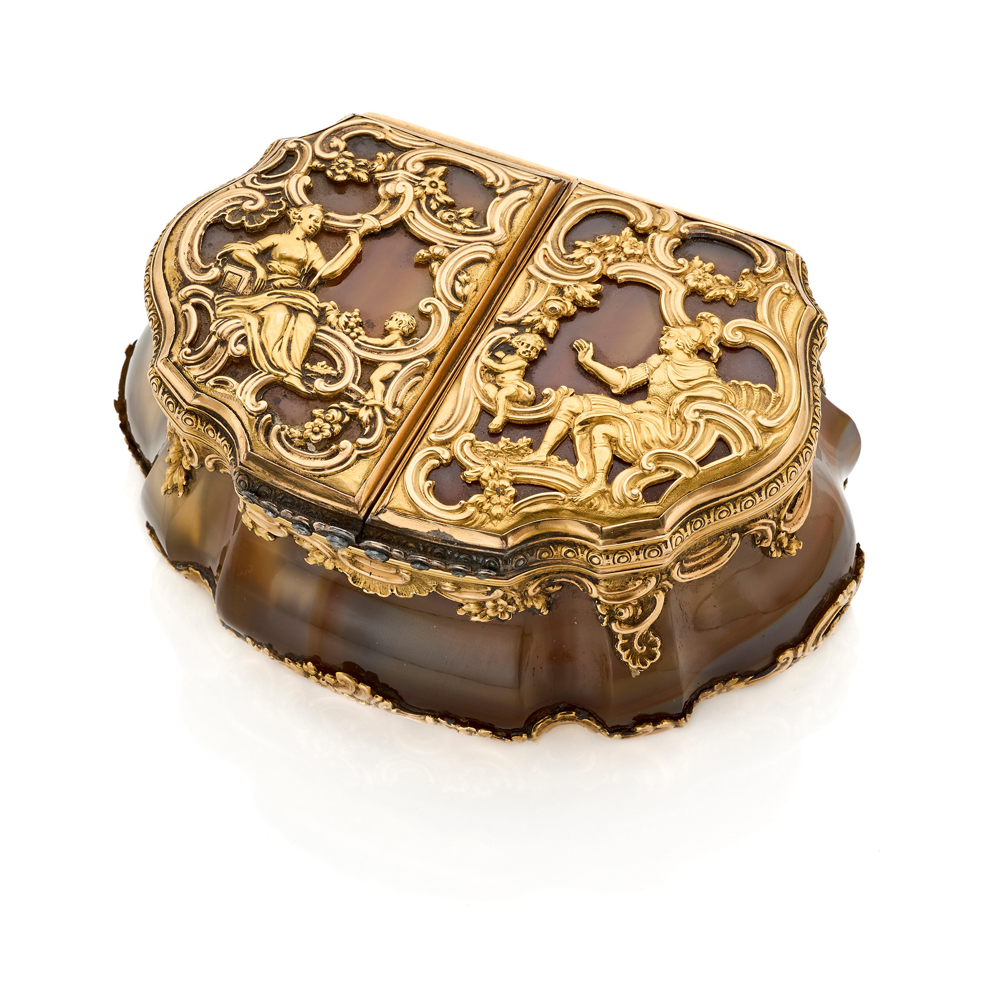 Agate and 18 Kt gold box decorated with Venus and Adonis scene and plant motifs.