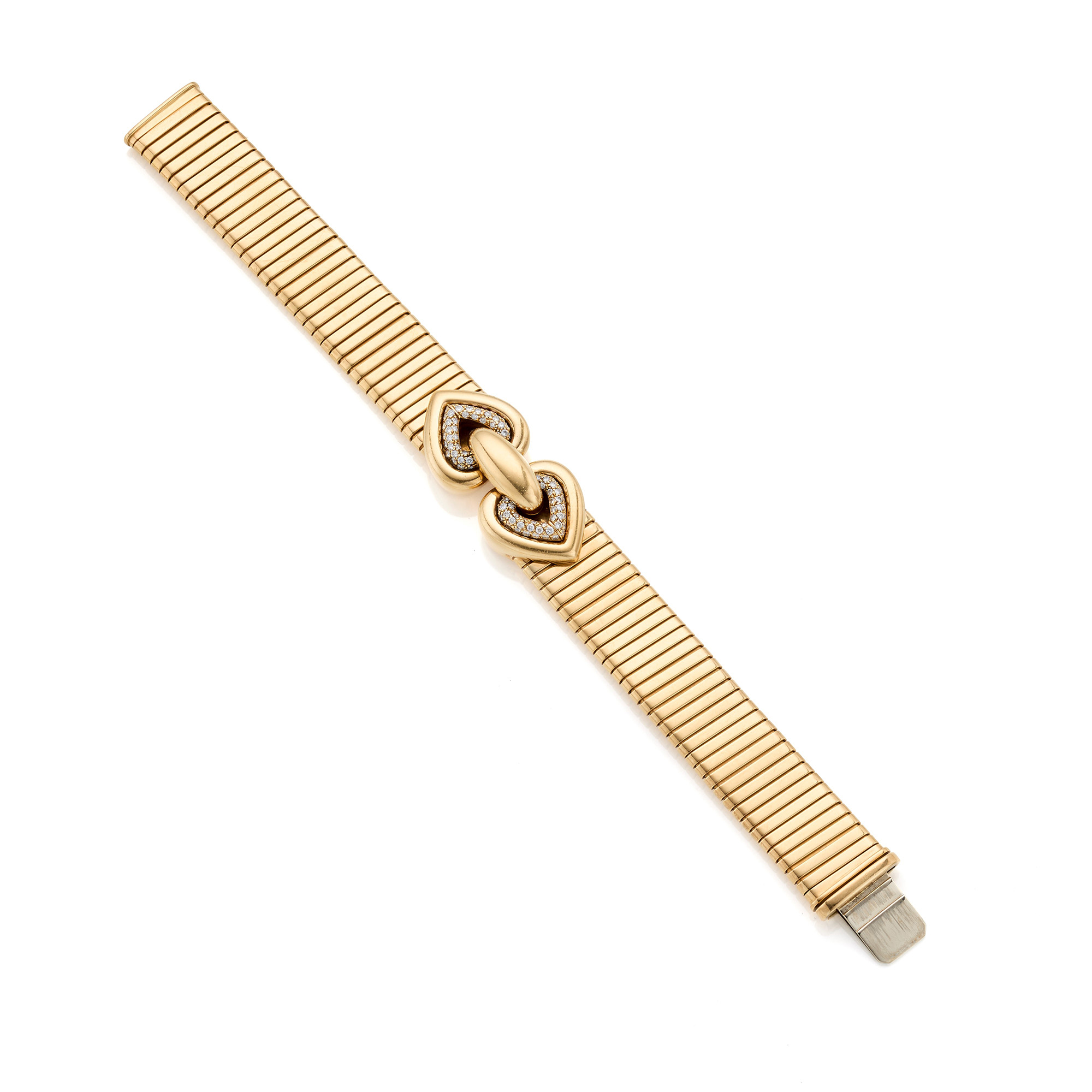 Bulgari tubogas bracelet Double Heart collection, in 18 Kt yellow gold set with round diamonds totalling approx. 0,50 ct.