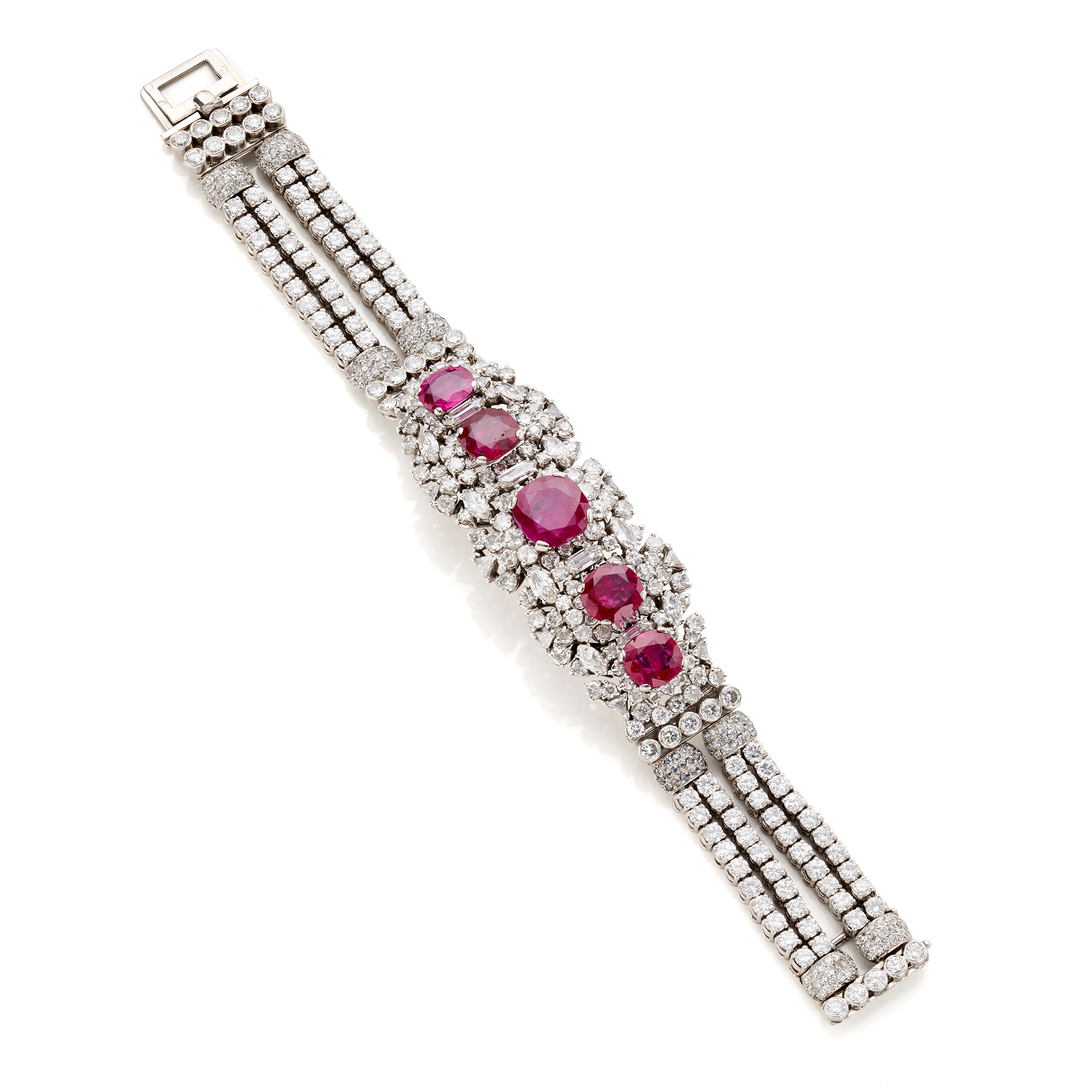 Platinum bracelet with five oval rubies totalling approx. 14,55 ct and round and baguette diamonds totalling approx. 9 ct.