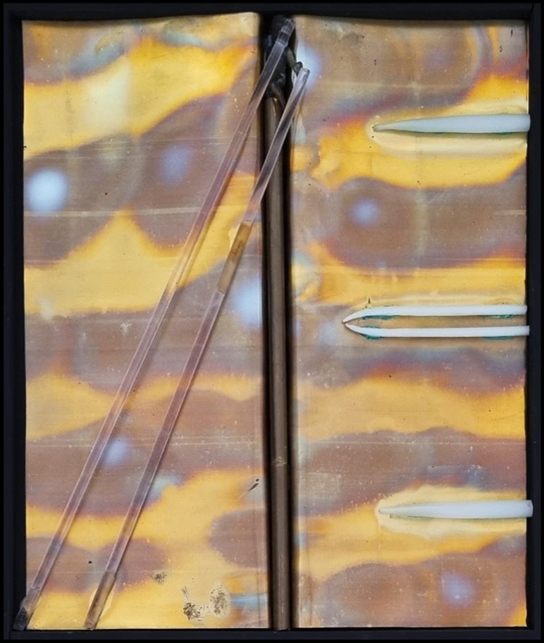 COLOMBARA PIERGIORGIO Genova 1948 "Lettera" Tecnica mista ed applicazioni di oggetti su tavola cm 43x50 del 1995. Sul retro firmato, datato ed intitolato. Opera pubblicata sul catalogo Art in Italy n. 6.