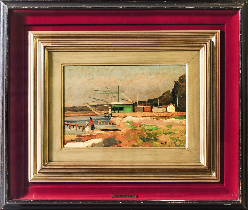 CAFIERO FILIPPELLI (1889-1973) Bocca d'Arno - Arno View olio su tavoletta - oil on panel, firmato, in cornice, al verso cartiglio e timbri Galleria d'Arte Athena, Livorno - With label and stamps on reverse cm 19,8x29,5