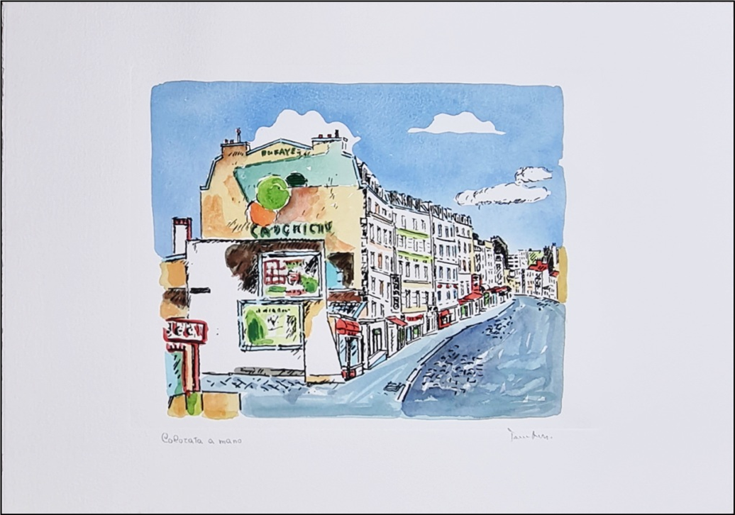 TAMBURI ORFEO Jesi 1910 - Parigi 1994 "Senza titolo" Incisione serigrafica acquerellata a mano, su carta pregiata, cm 50x35, pezzo unico. Firmata sul fronte in basso a destra, dicitura "ritoccata a mano" a sinistra.