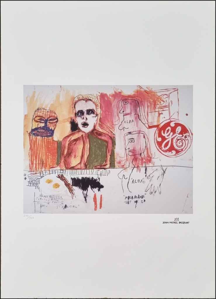 BASQUIAT JEAN-MICHEL New York 1960 - 1988 "Senza titolo" Riproduzione litografica offset su cartoncino, cm 50x70. Firma in stampa sul fronte in basso a destra, tiratura a matita 200/250 e timbro a secco in basso a sinistra.