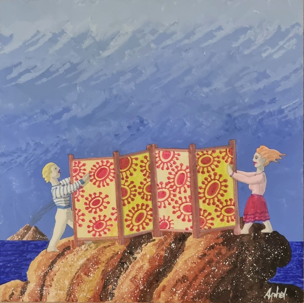 APHEL FABIO Cavalese (TN) 1957 "Il paravento" Olio su tavola cm 25x25. Firmato sul fronte in basso a destra. Al verso firma, titolo e numero d'archivio.
