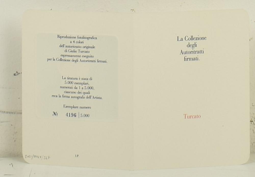 riproduzione fotolitografica a 4 colori dell'autoritratto di Giulio Turcato, cm 8x8, su foglio cm 14x10,5; es. 4196/5000