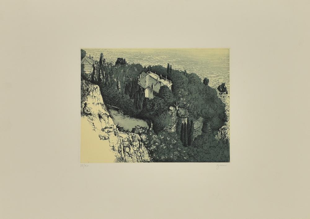 Acquaforte acquatinta a due colori su fondino di carta Japon, mm 245x320, su foglio cm 49,5x70; es. 32/50