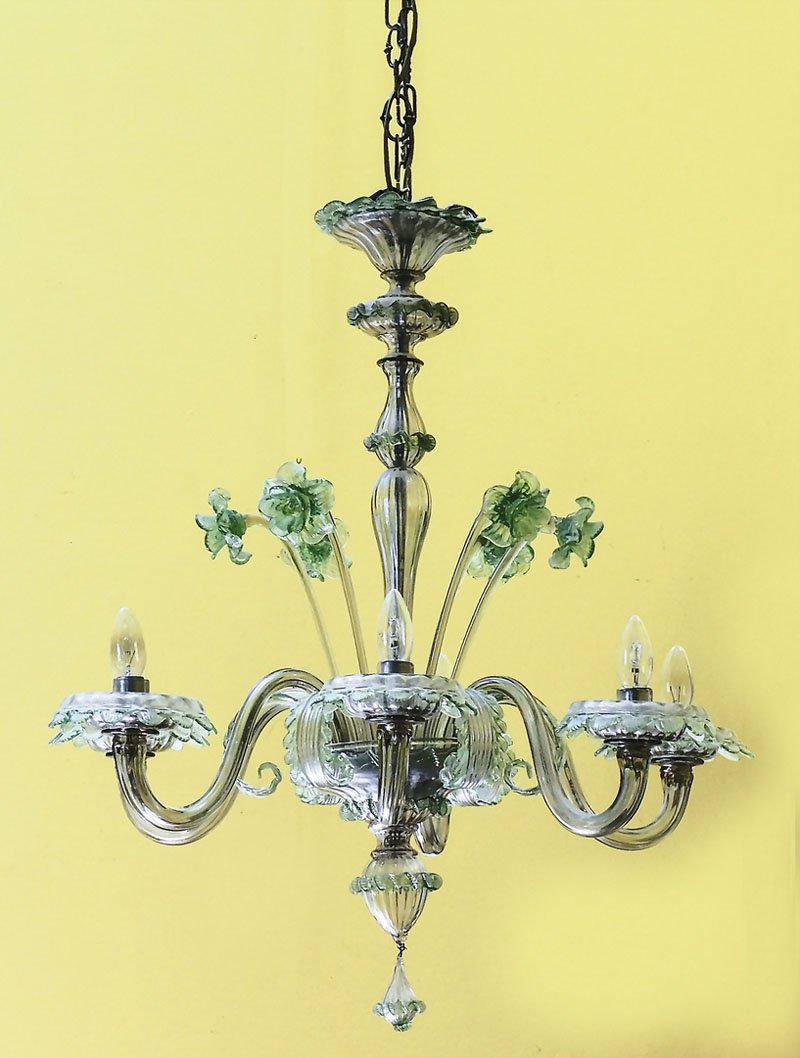 LAMPADARIO IN VETRO SOFFIATO DI MURANO - VENETIAN GLASS CHANDELIER sei bracci portacandele a voluta, foglie e fiori nei toni del verde acqua h cm 65