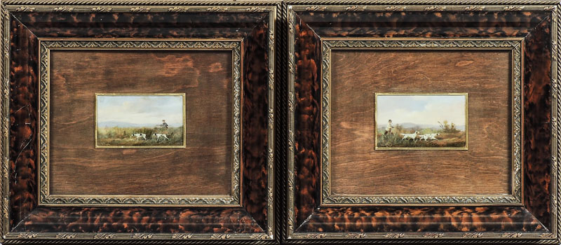 RENATO ZINI (1890-1969) Scene di caccia - Hunting Scenes coppia di dipinti ad olio su tavoletta - a pair of oils on panel, firmati, in cornice cm 6x10 (2)