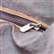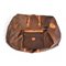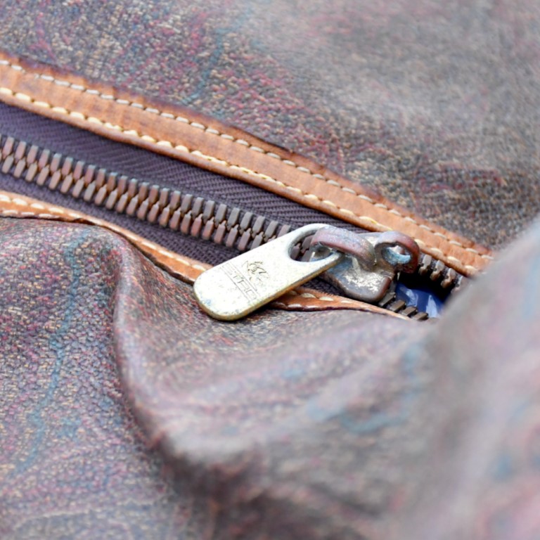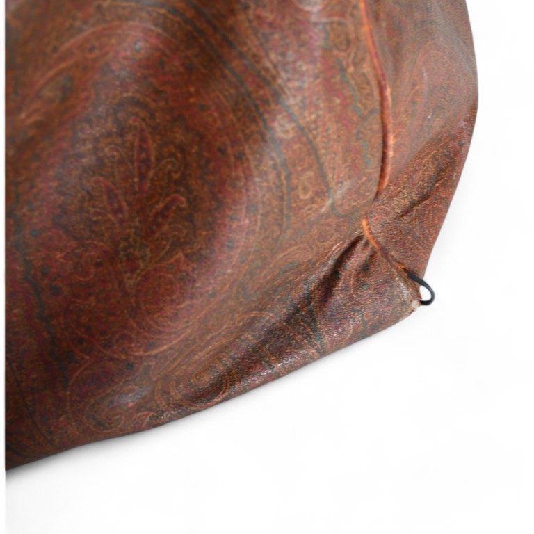 realizzato in tela Paisley jacquard con finiture e doppi manici in pelle color cammello. Ampia tasca interna e bor- sone con chiusura a zip, parti metalliche e borchie dorate, interno beige
