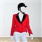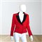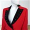 in crepella di lana, con revers a lancia e profili di velluto nero, taglio a due bottoni. Tasche con patte con chiusura a tre bottoni.