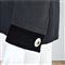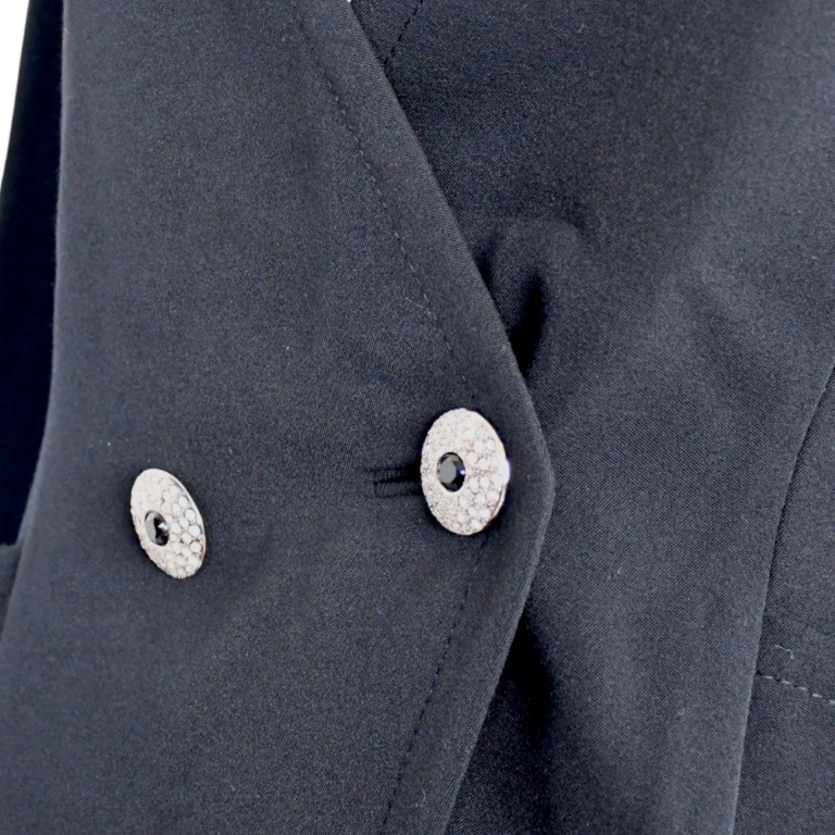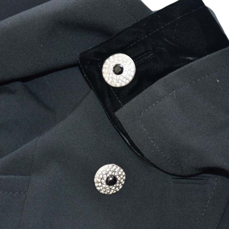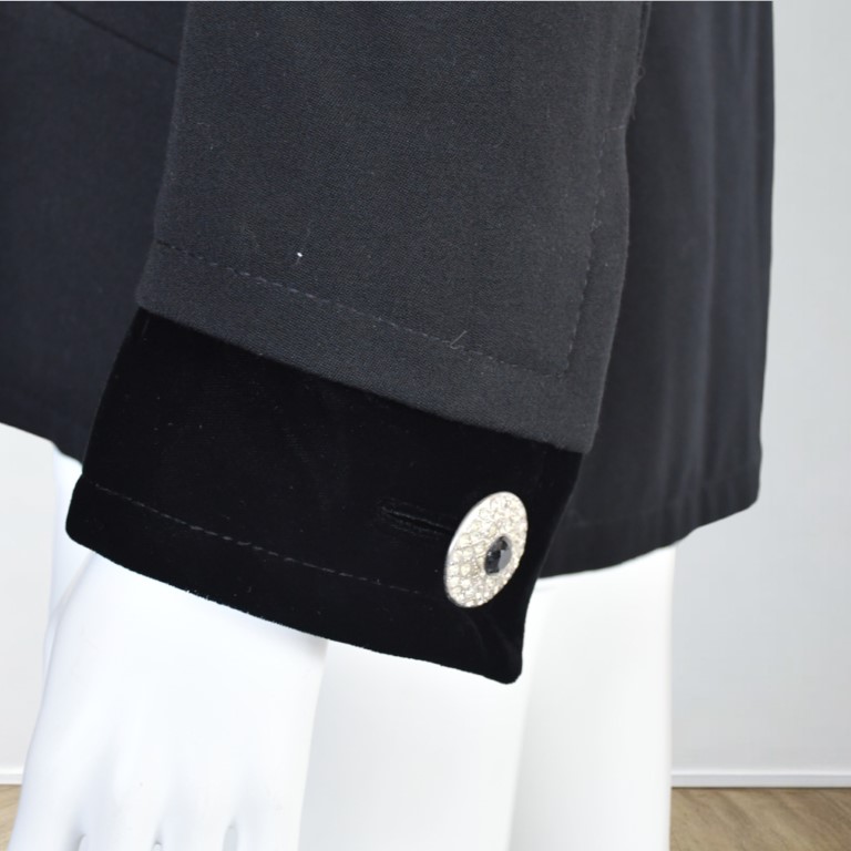 con spalline, ampio scollo a V., due ampie tasche e bottoni gioiello. i polsi sono rifiniti da una fascia di velluto nero.