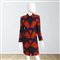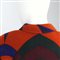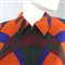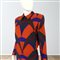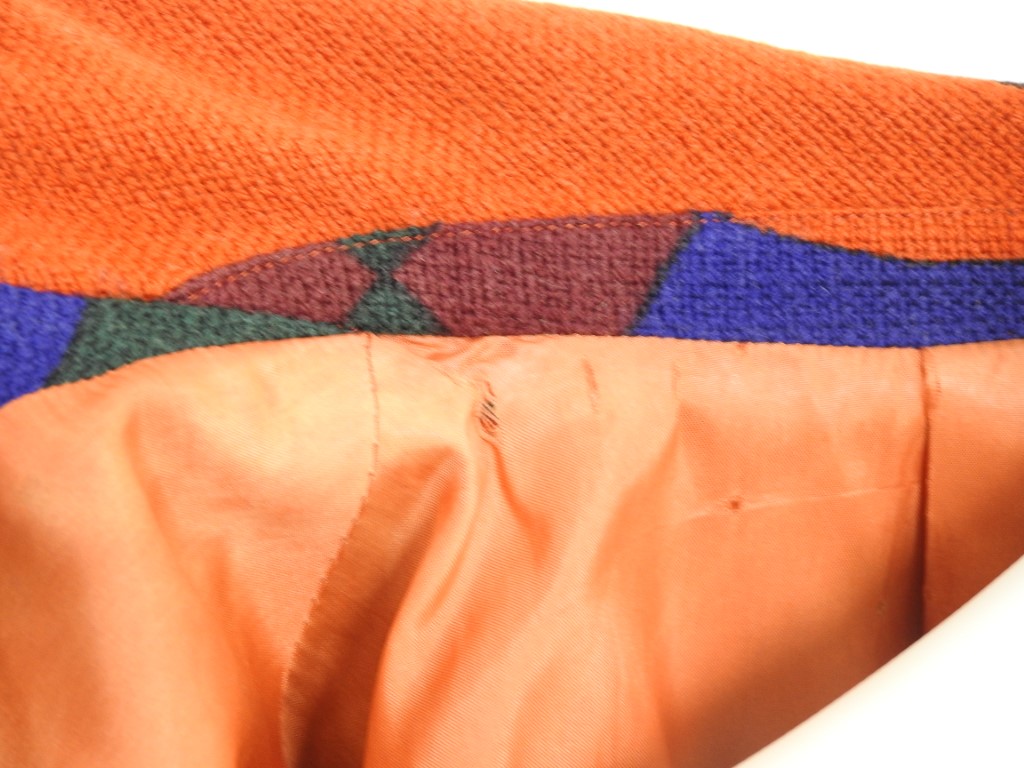 Tailleur misto cotone, a fantasia geometrica, base arancione, disegni sui toni del blu verde e bordeaux. Giacca con spalline