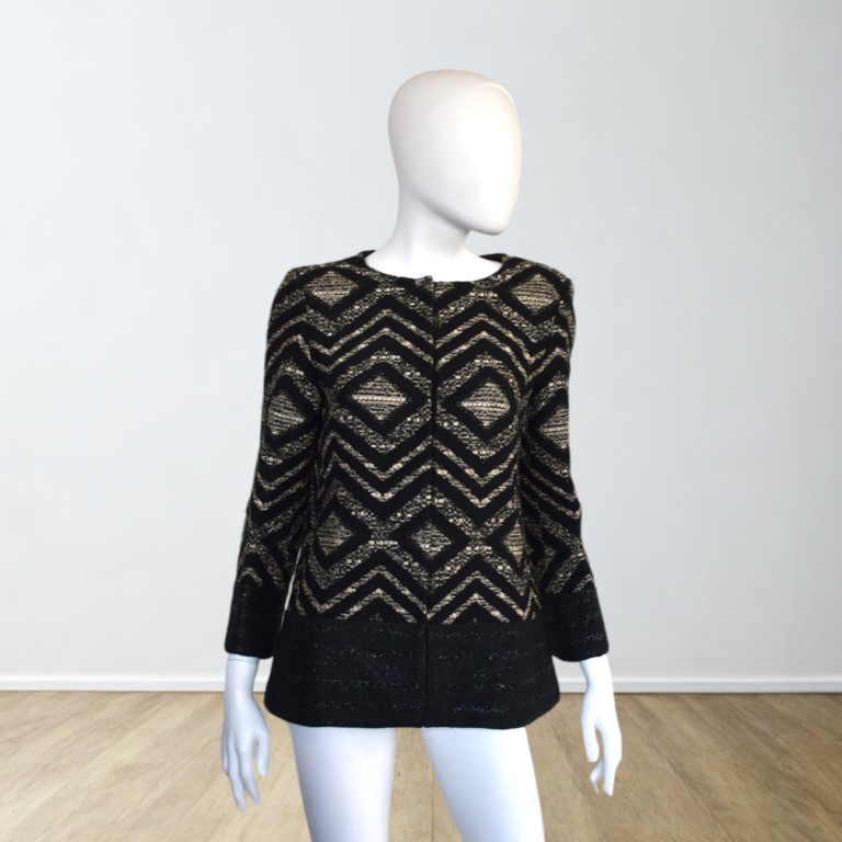 misto Lana/ Poliestere / Acrilico, a fantasia geometrica, con chiusura a sei bottoni nascosta, interamente foderato all'interno.