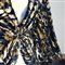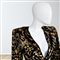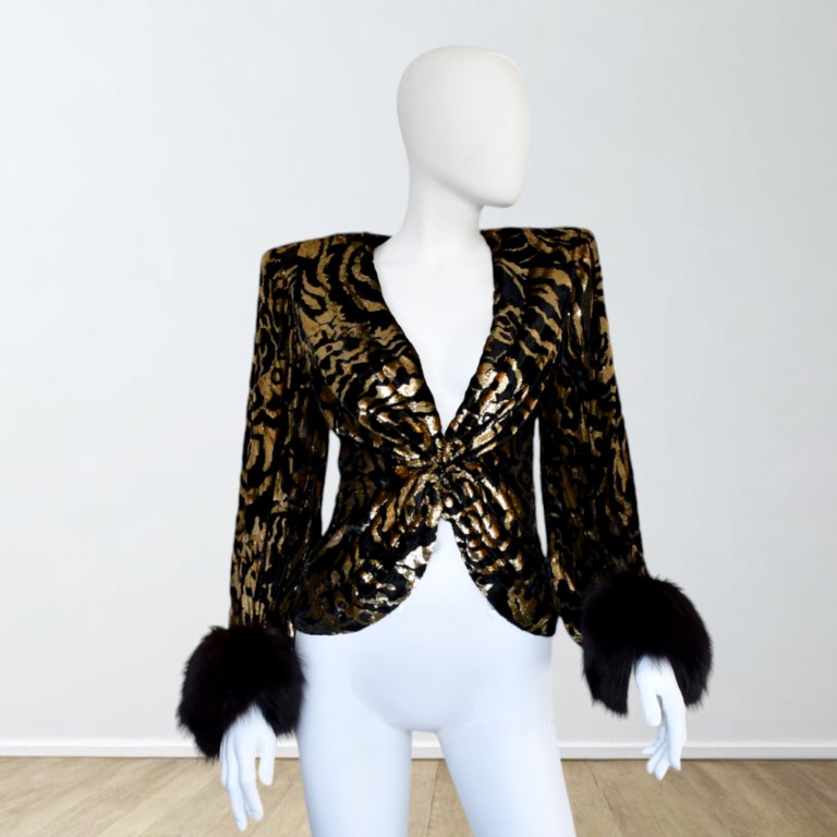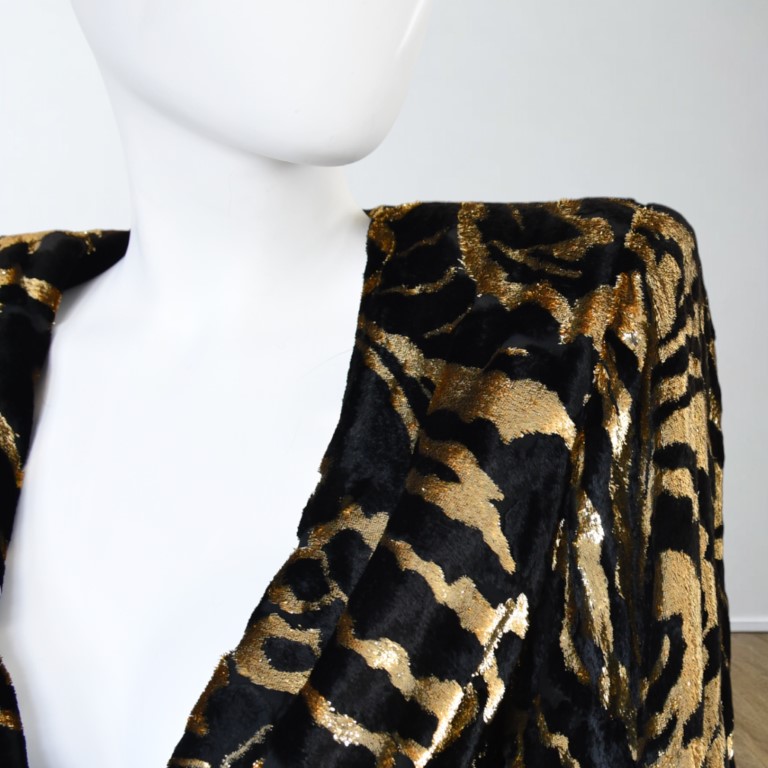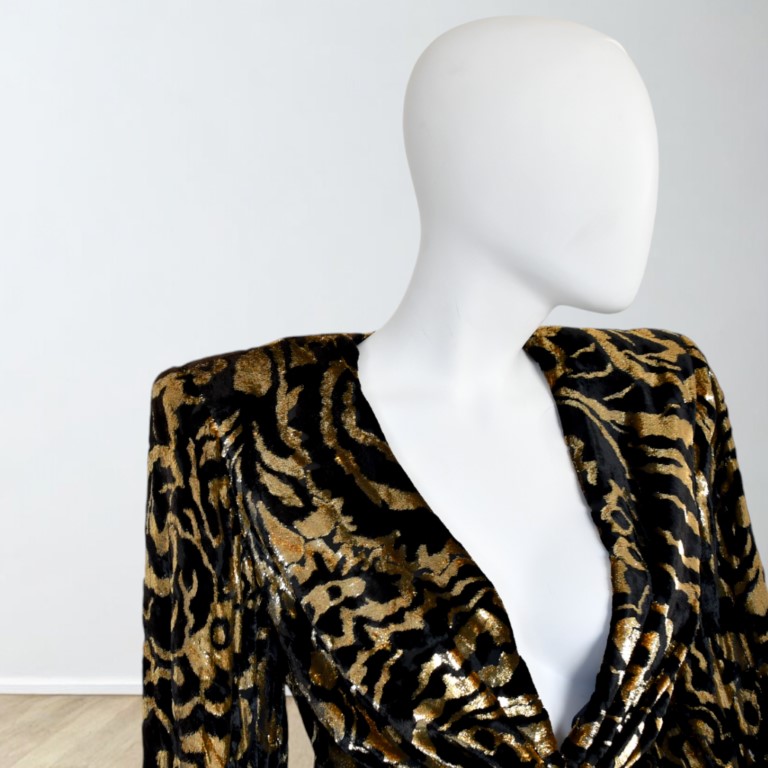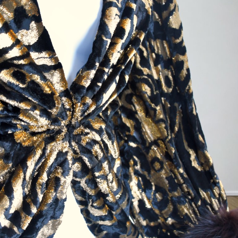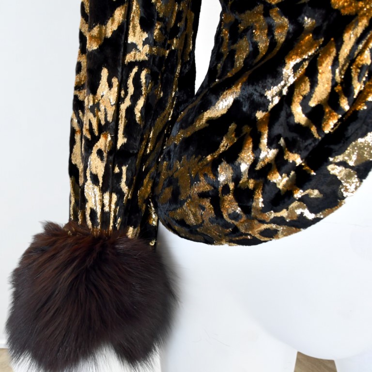 in velluto di seta dévoré a fantasia lamé oro, con manicotti in pelliccia sintetica neri. Cintura invisibile interna a tre ganci. Con spalline