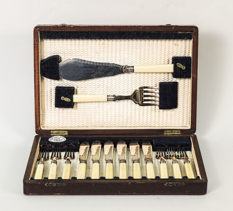 SERVITO DI POSATE DA PESCE IN SHEFFIELD E ARGENTO - SHEFFIELD, SILVER FISH CUTLERY SET Città di Sheffield, 1904 - City of Sheffield, 1904 completo per sei persone, composto da 6 forchette, 6 coltelli, 2 posate da portata, entro scatola originale (14)