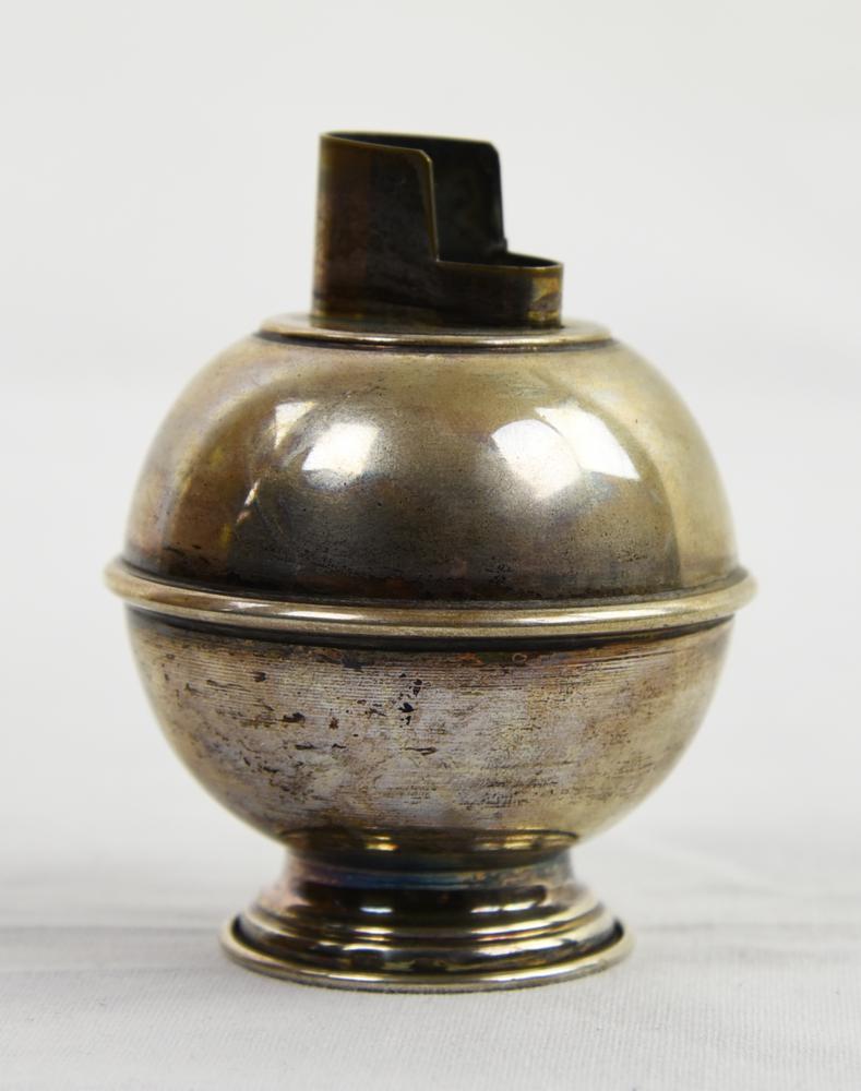 PORTA ACCENDINO DA TAVOLO in metallo argentato, di forma sferica, cm 7