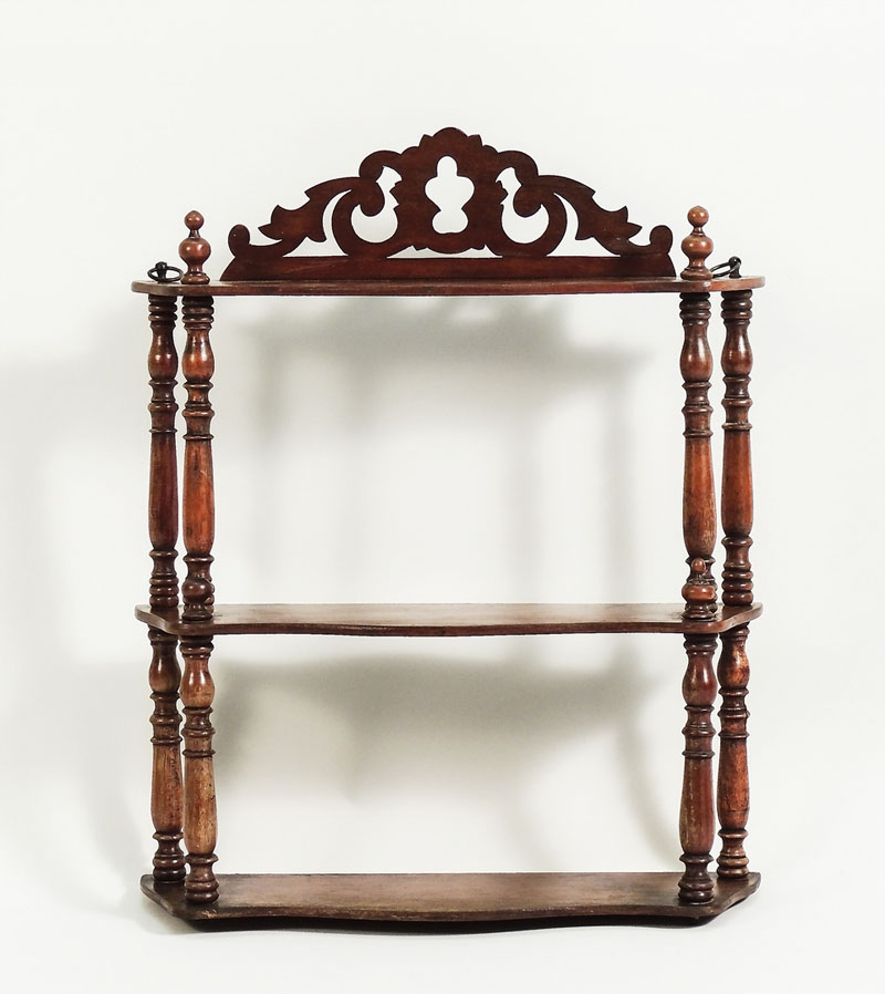 ETAGERE PENSILE IN MOGANO - MAHOGANY WALL ETAGERE Inghilterra, fine del XIX secolo - England, late 19th Century tre ripiani a giorno, fronte sagomato, fregio centrale intagliato a traforo, sostegni torniti h cm 46x38x11