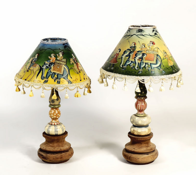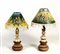 COPPIA DI TORCIERE IN LEGNO TENERO - A PAIR OF SOFTWOOD TABLE LAMPS dipinte nei toni pastello, montate a lume, con paralumi di gusto orientale h cm 34, h cm 37