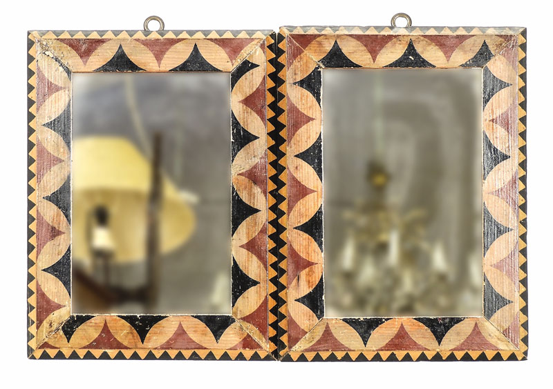 COPPIA DI CORNICI IN LEGNO TENERO - PAIR OF PAINTED WOODEN FRAMES dipinte con motivi geometrici, con specchi cm 37,5x27