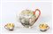 TEIERA IN PORCELLANA - PORCELAIN TEAPOT Capodimonte, inizio del XX secolo - early 20th Century istoriata in policromia con scene mitologiche su fondo dorato, manico realizzato ad imitazione di un ramo di corallo, tre piedini zoomorfi, corredata da coppia di tazzine en pendant, una con difetti (3)