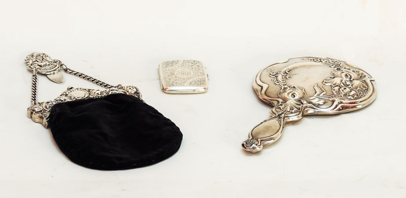 LOTTO DI OGGETTI IN ARGENTO - SILVER LOT una borsetta in velluto nero, Chester, 1899, uno specchio da toilette, Birmingham, 1907 ed un portasigarette, Chester, 1915 (3)