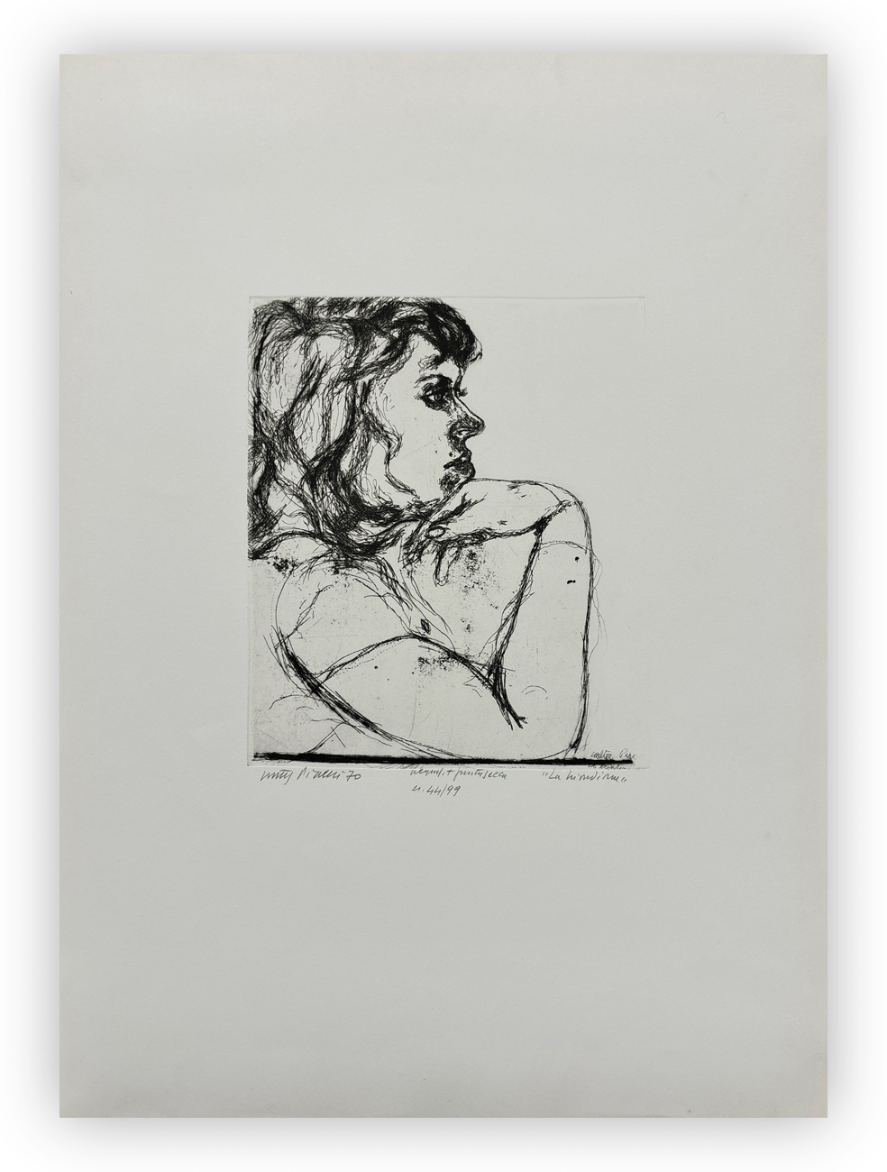 Firma, titolo, tecnica, datazione e numerazione (Esemplare 44/99) a matita al fronte